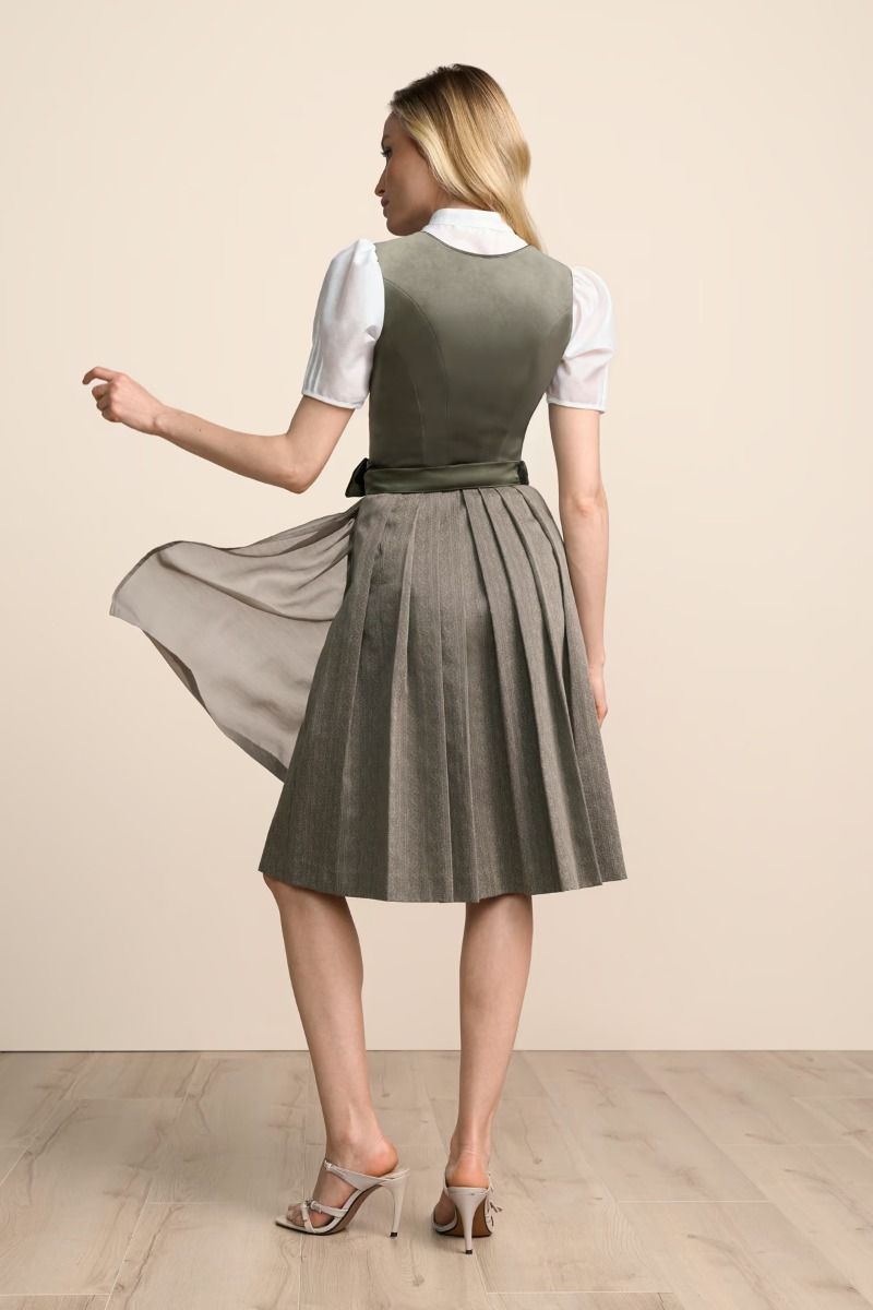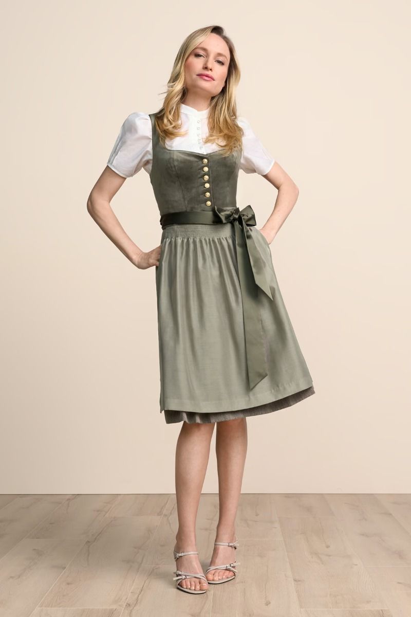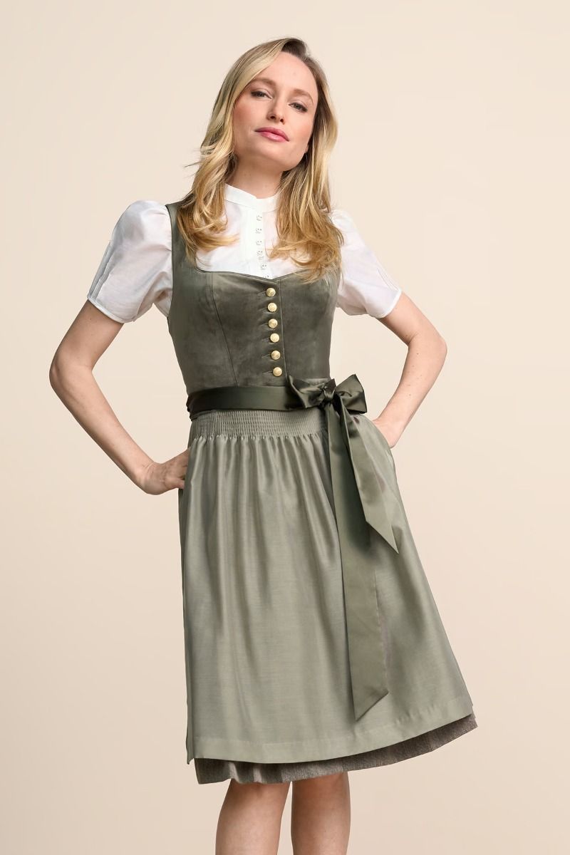 Ontdek onze elegante fluwelen dirndl Avara, die meteen in het oog springt met zijn effen ontwerp en sierrok. De getailleerde snit benadrukt smaakvol je silhouet en creëert een vrouwelijke look. Met een roklengte van 60cm, die tot net onder de knie reikt, heeft de dirndl ook twee praktische steekzakken. De dirndl sluit met stijlvolle knopen en geeft de look een geraffineerde touch. Het mouwloze ontwerp zorgt voor een verfijnde, elegante uitstraling. De effen schort contrasteert mooi met de delicaat versierde rok en maakt de look helemaal af. Zonder vetersluiting aan het lijfje biedt deze dirndl een moderne, tijdloze interpretatie van de klassieke stijl.