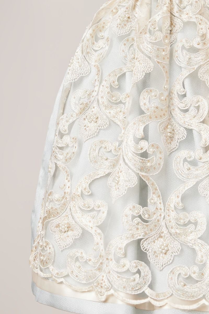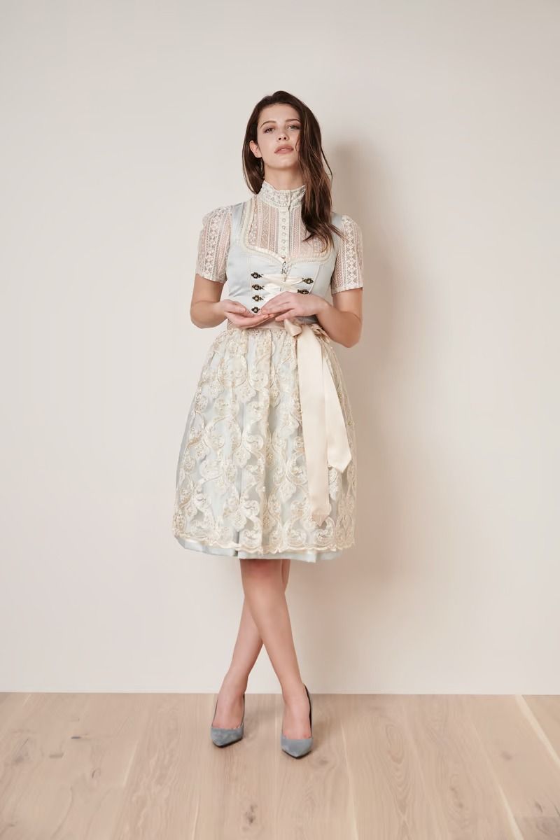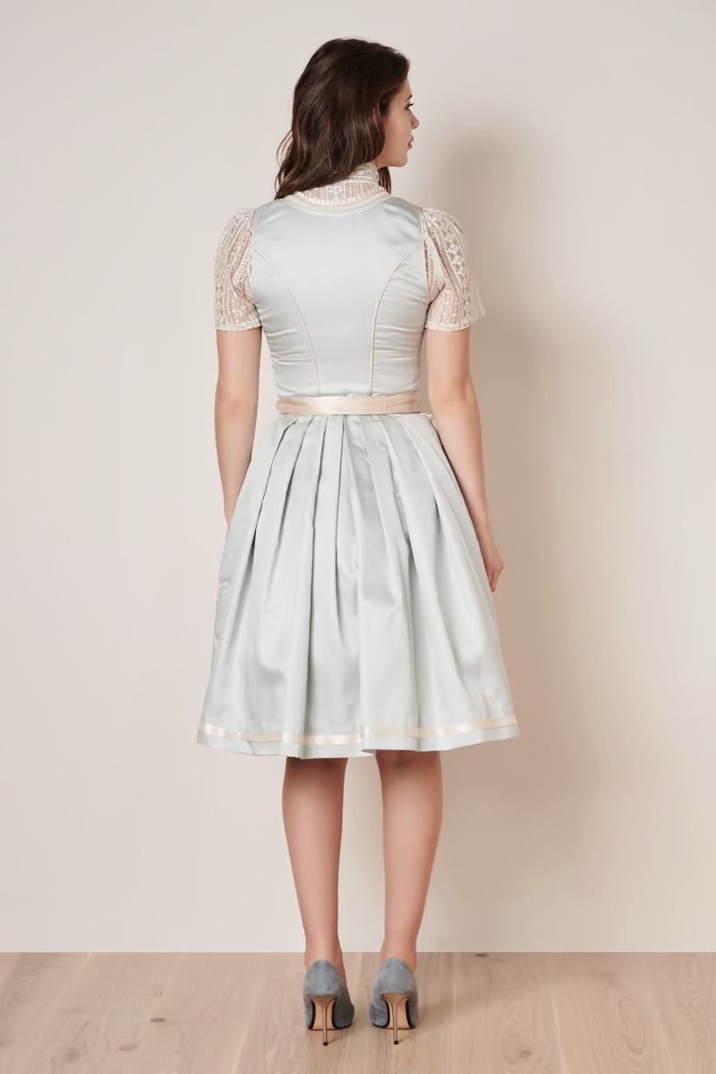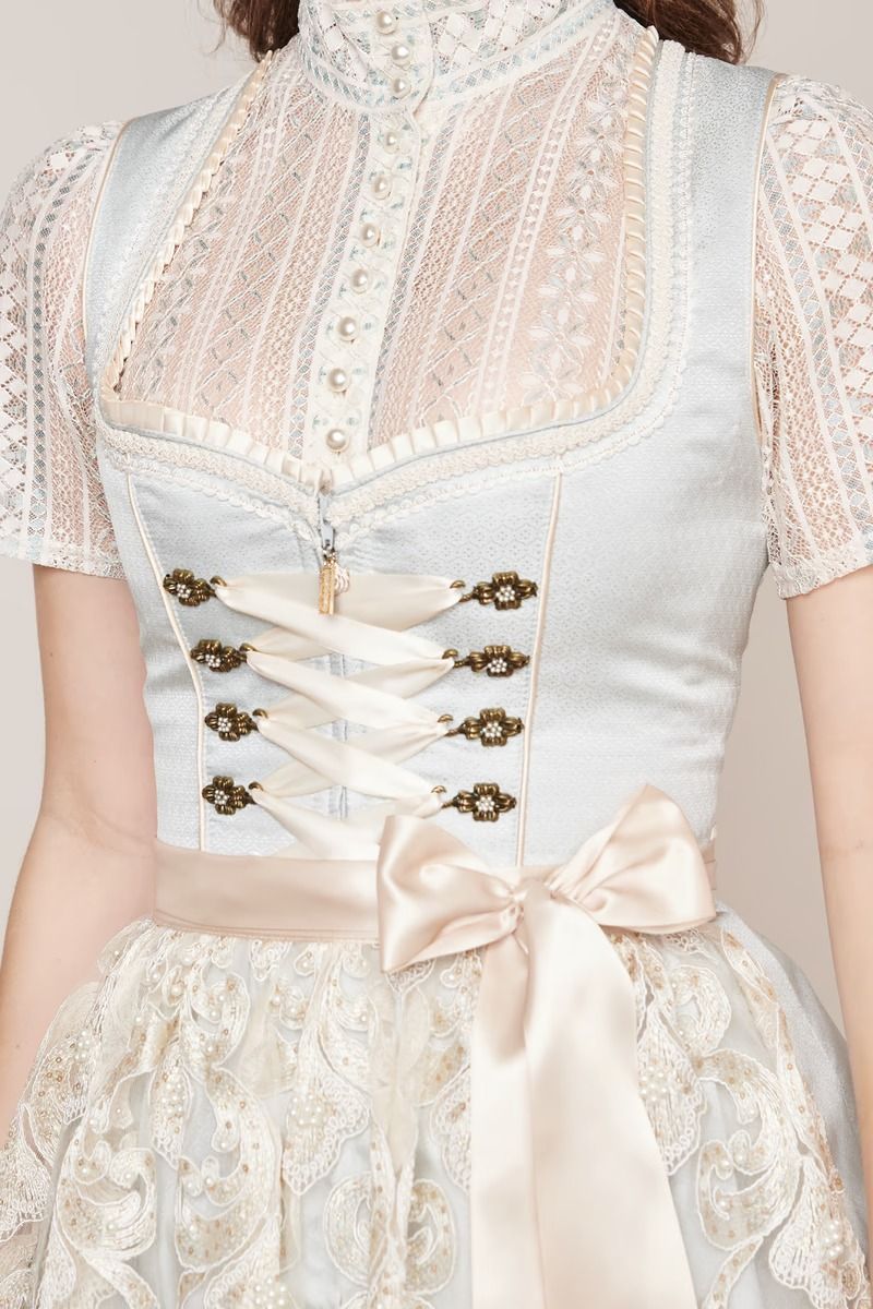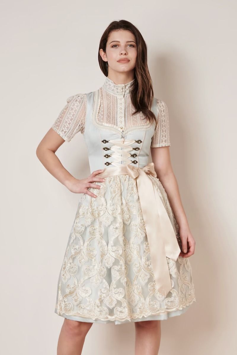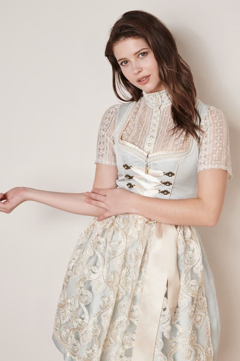 De Dirndl Dalina betovert met een chique schort met prachtige kralen en borduursels. Delicate versieringen en mooie ritsen sieren de dirndl.