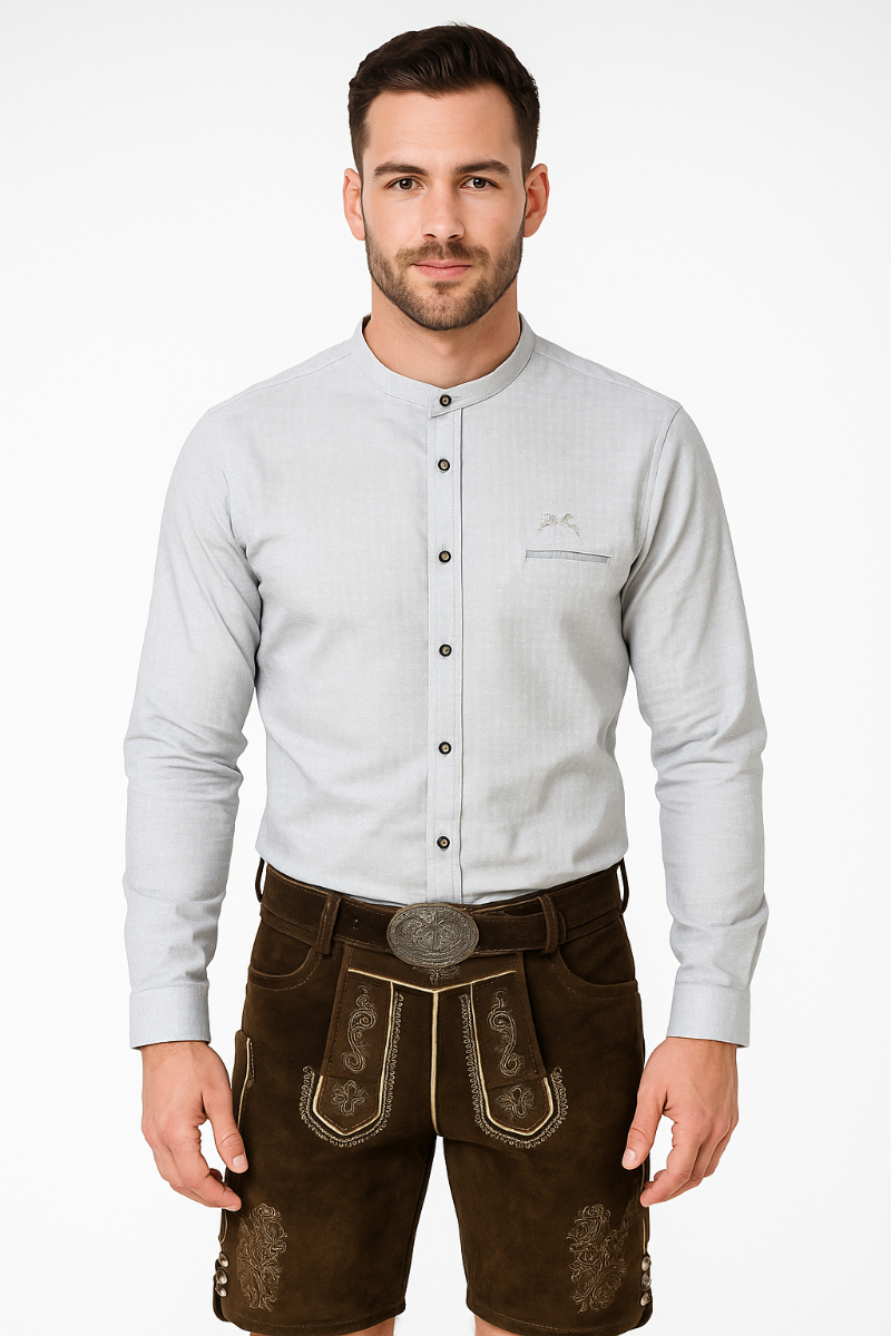 Trachtenhemd met opstaand boord en lange mouw. Dit hemd is gemaakt van 80% PE en 20% katoen, de pasvorm is slimfit
